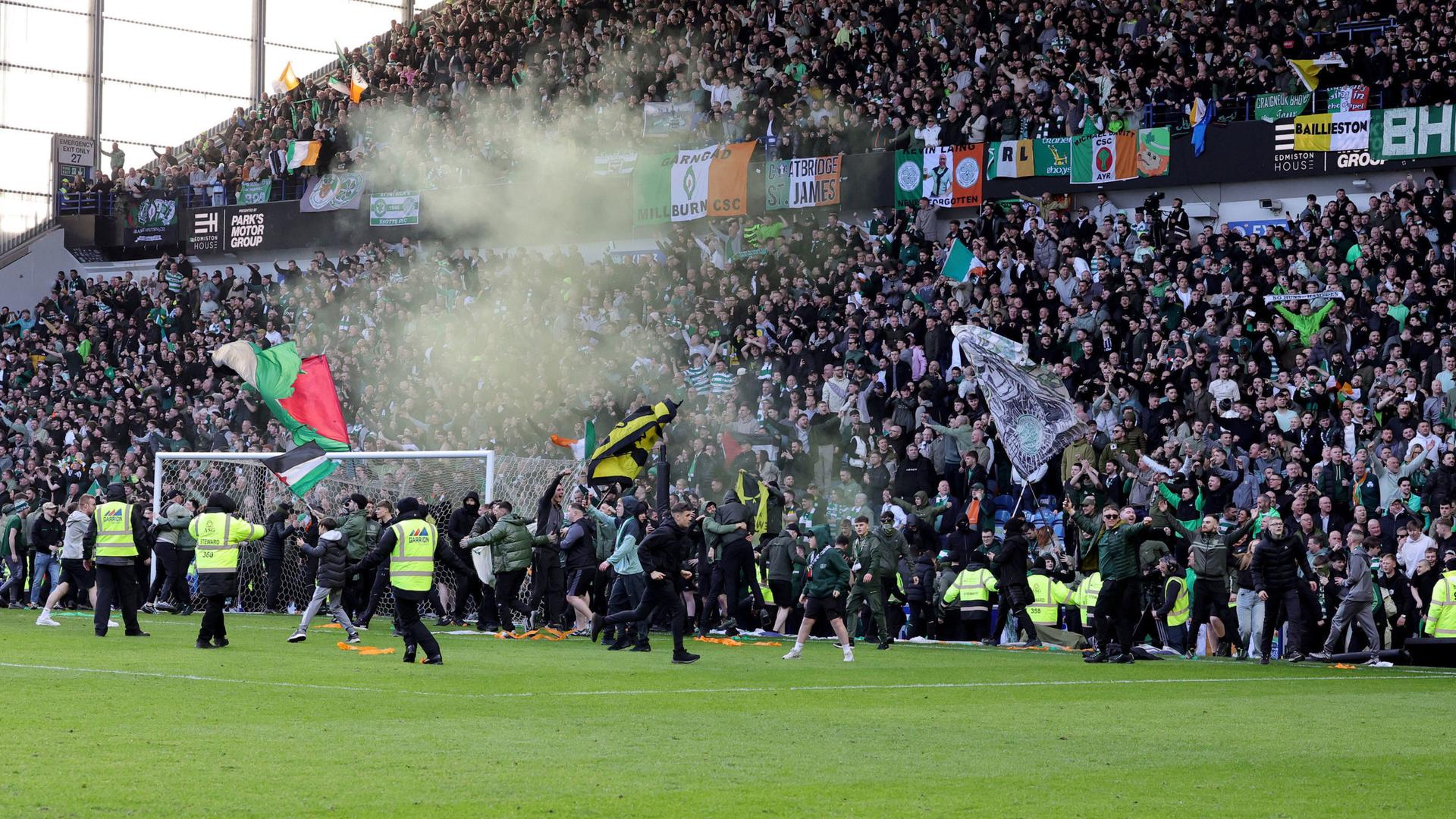 Nach dem Sieg von Celtic Glasgow im schottischen Pokal nach Elfmeterschießen bei Erzrivale Rangers stürmten Fans beider Teams im Ibrox-Park den Platz.